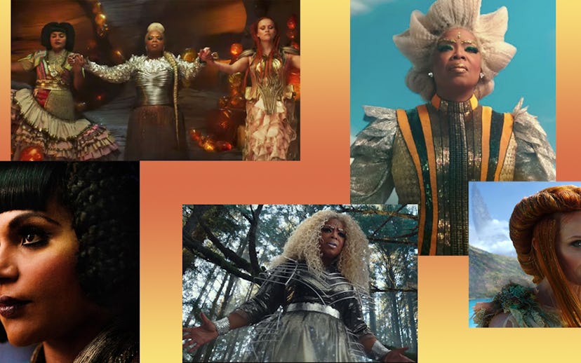 Sci-fi, avant-garde, and next-level were all terms used for general inspiration, but each character in the film very much has their own individual look. But the looks that stand out the most are those of the three primary celestial beings—Mrs. Who, played by Mindy Kaling; Mrs. Whatsit, played by Reese Witherspoon; and Mrs. Which, played by Oprah Winfrey. Their beauty looks are the ones that required the most work and are the most exquisite.