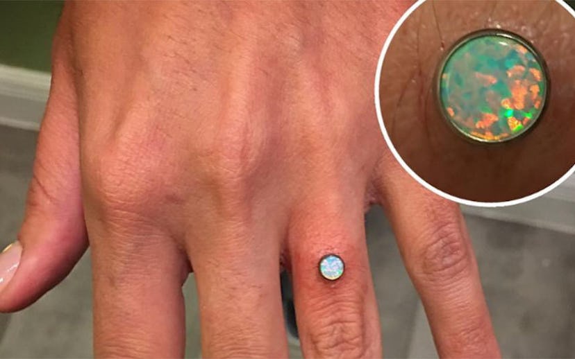 Thanks to Instagram, more and more people are getting finger dermal piercings instead of wearing engagement and wedding rings. The process is simple: A patch of skin is removed from the finger before the piercer inserts an implant-grade titanium anchor that the gem gets attached to, making it appear like the stone is embedded in the skin. A novel idea that is both neat and cringe-y at the same time.