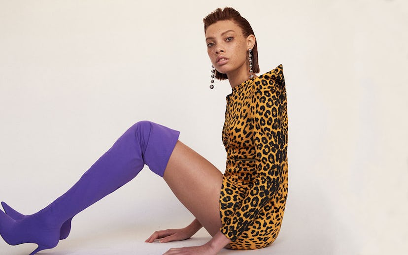 Public Desire, Refuge Over The Knee Boots, $63, available at ASOS; ASOS, Leopard Print Open Back Mini Dress, $76, available at ASOS; ALDO, Daollan Ball Drop Earrings, $14, available at ASOS.