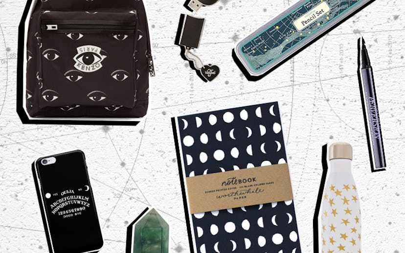 1. Kenzo, Black Nylon Eye Backpack, $360, available at Ssense; 2. Valfre, Bruno USB Drive, $24, available at Urban Outfitters; 3. Paper Source, Cavallini Celestial Pencil Tin, $13, available at Paper Source; 4. Urban Decay, Perversion Waterproof Fine-Point Eye Pen, $22, available at Sephora; 5. Redbubble, Ouija Board iPhone Case, $25.83, available at Redbubble; 6. Advisory Board Crystals, Fluorite, $30, available at Advisory Board Crystals; 7. Hauswitch, Moon Phase Notebook, $16, available at Hauswitch; 8. S’well, Star-Crossed, $35, available at S’well.