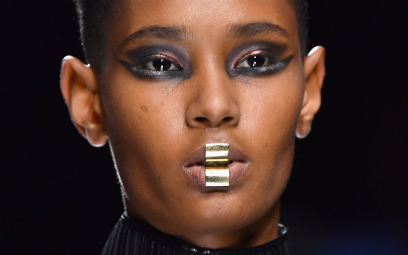 With Kurt Cobain blaring over the speakers, models wore garments typical of Rousteing’s designs—a lot of structure, leather, and sparkle—and which also incorporated harnesses, acid wash, band tees, and more. However, while we’re all for an ode to grunge when it comes to fashion, the real stunner of this season’s show was the beauty look.