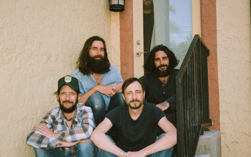 The last place you would expect to find Southern rock ’n’ roll brotherhood Band of Horses is in the backyard of an Airbnb near the nail salons of Beverly Hills. Yet, there they are, their look screaming Friday evening at a saloon in One-Horse Town, USA. Frontman Ben Bridwell straddles a bench, dressed in double denim, a plaid shirt, and a trucker hat. A bottle of beer dangles by his scrawny hip in a holster branded with his first name. Drummer Creighton Barrett sits next to him, beer in heavily tattooed hand. Bridwell points to his holster, which reads “Sexy Beast.” “There’s no question who that beer belongs to,” he says with a smile.
