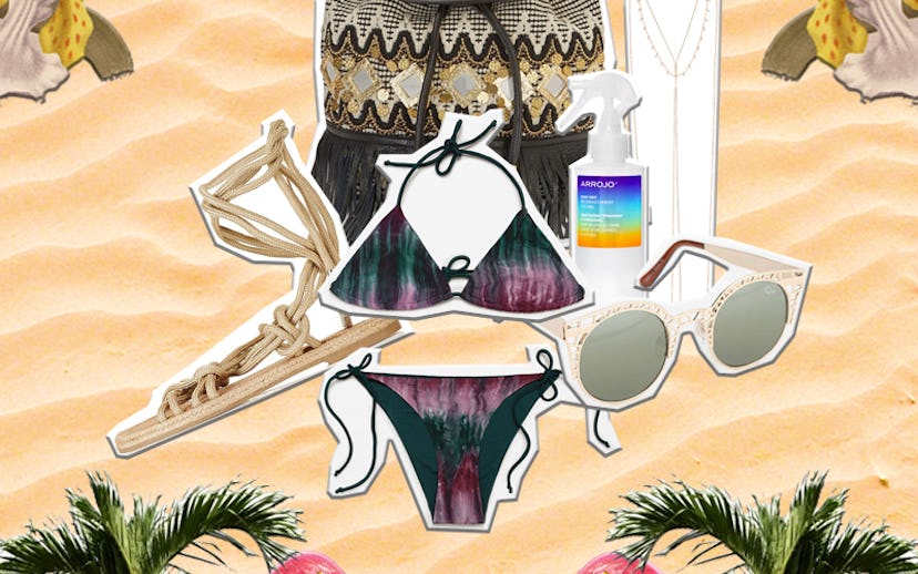 1. Rebecca Minkoff, Taj Backpack, $325, available at Rebecca Minkoff; 2. Arrojo, Wave Mist, $22, available at Arrojo; 3. Topshop, Fabric Tie Sandals, $75, available at Topshop; 4. Kendra Scott, Joslyn Body Chain in Rose Gold, $95, available at Kendra Scott; 5. Quay, Fleur Round Cat-Eye Sunglasses, $45, available at Urban Outfitters; 6. Zara, Tie-Dye Effect Bikini Top, $22.90, available at Zara; Zara, Tie-Dye Bikini Briefs, $19.90, available at Zara.