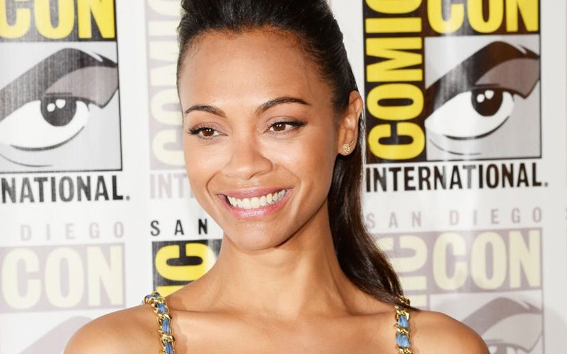 The whole Rapunzel hair look is awesome--until it's 100 degrees (or, sorry, as Weather.com likes to remind me, "100 degrees, feels like 105") and your neck is twice as hot as the rest of your body. So we totally get why Zoe Saldana arrived to San Diego's Comic-Con with her hair in a ponytail. And not only that--she made it look totally red carpet acceptable.