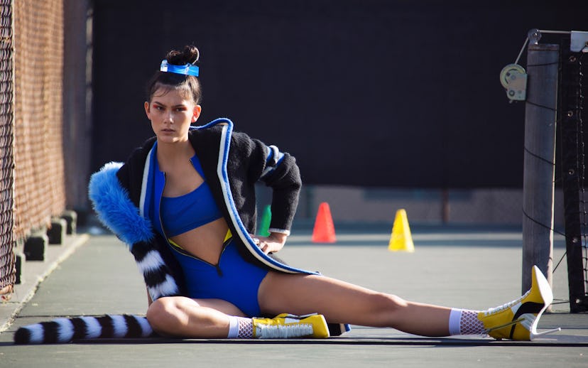 Jacket by Miu Miu, bodysuit by Dion Lee, shoes by DKNY, necklaces by Chrome Hearts, tennis racket by Chanel.