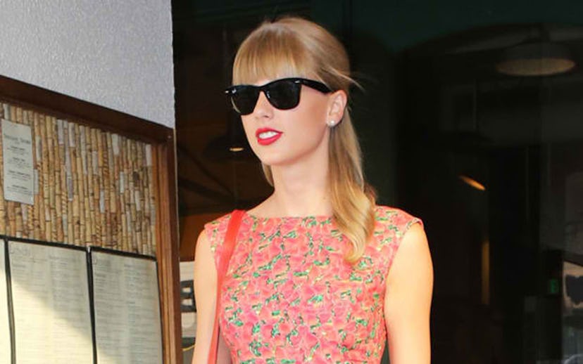Swift opted for a prim floral dress with Ray-Ban shades and Salvatore Ferragamo bow wedges while in Los Angeles this week. She added a red purse to match her red lipstick, and pulled her hair into a half-up ‘do. We're totally into Swift's look today because sometimes you just want to feel really pretty and girly–like Legally Blonde-level–and not care who knows it.
