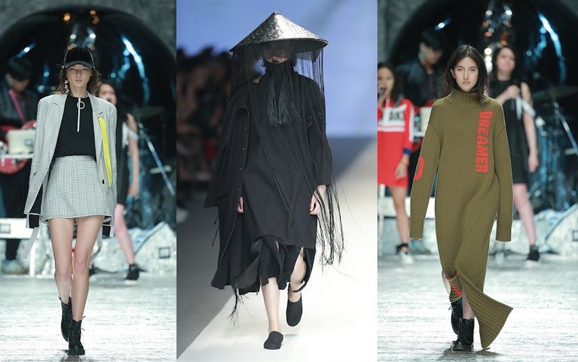 In other words, Shenzhen (that’s in China) Fashion Week, which just wrapped, should be on your radar. It was my third season attending these shows for a number of reasons: 1) I never want to miss the Marisfrolg show, which Soo Joo Park opened two seasons ago, because they’re Shenzhen fashion royalty. They’ve consistently kept it very chic and cute, giving me many Katie Holmes-grabbing-a-latte-on-Madison moments since the beginning. But they murdered that vibe this week with a youthful streetwear-heavy collection. Gorgeous models stormed the runway rocking many a zany and destructed (albeit wearable) head-turner. On display was an onslaught of exaggerated sleeve lengths, humungous sweaters and parkas, punky skirts, killer thigh highs, and the maniacal more. The recent-ish trend of printing words on garments was there, too: “Dreamer” on an awesomely oversized matcha green sweater dress, "Real" on what looked like a gift ribbon choker. Think Hood By Air x Nicopanda x Off White, sometimes with a side of Paco Rabanne. Very V-Files-rack friendly. Also, the styling and accessorizing was on point. Lots of beanies and baseball hats and Balenciaga-esque styled knit scarves and single earrings. Rihanna x Charli XCX x Janet Jackson circa Rhythm Nation-era, if you will. Oh! A Dragonette-ish, electronic girl band duo barked into their mics over frenetic space-y beats. The massive silver orbs lining the tinfoil runway superglued the whole intergalactic thing together. And, as a result, it all made me wanna post a photo of Sarah Jessica Parker in the cult classic film Mars Attacks.