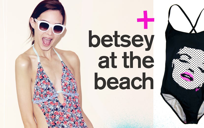 But then again, there are also sleeker cuts with a downtown twist, such as a criss-cross maillot stamped with her iconic face and a retro two-piece splashed with hot pink lips. The only bad news? Betsey Johnson's swimwear collection won't hit stores until October, which mean we'll miss our chance to wear it this beach season. Hey, there's always winter vacation...LIZA DARWIN
