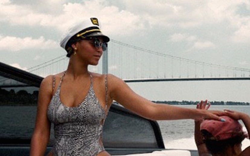 As indicated by her hat, Bey took on the role of captain—because she is queen of everything—and wore a black-and-white one-piece swimsuit with cut-outs that matched Blue Ivy’s suit and baseball cap, while Jay was on photo duty documenting it all for Instagram.