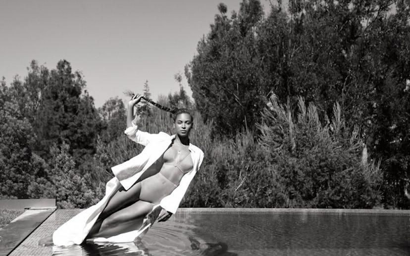 Along with this word bubble, the spread includes a selection of intimate photos showing the singer relaxing in and around a pool. While we love seeing Queen Bey dressed to the nines, it’s refreshing to see a toned-down, almost Zen side of her. We bow down, either way.