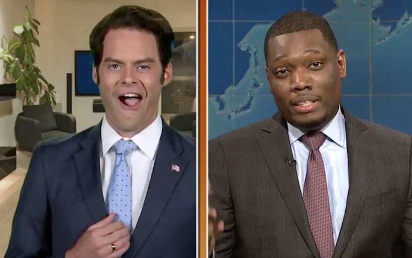 When Anthony Scaramucci hears his name three times, he appears like a "goombah Beetlejuice," Bill Hader explained to Michael Che on the first episode of SNL's spin-off show, Weekend Update Summer Edition, which aired last night. The comedian made a guest appearance via FaceTime to let us know that The Mooch is doing just fine after leaving the White House. He is, however, still looking for a job.