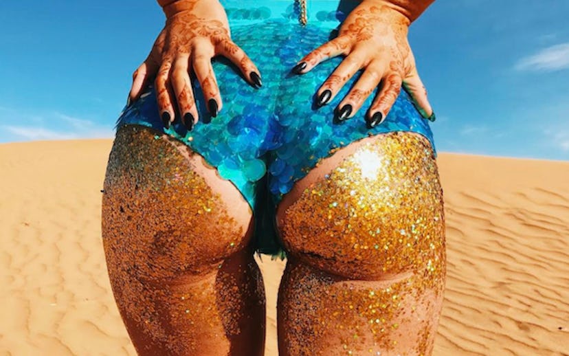 Summer music festivals have basically become Halloween for hip 20-somethings. Besides the standard flower crowns, rompers, boho beauty looks, and a selection of culturally-appropriative items, it's also the place where It-girls and party girls can wear their very best crazy shit and hope to get their picture posted on someone's fashion site. To take things to the next level, makeup artists Mia Kennington (who calls herself a "glitter creature") and Sophia Moreno then came up with an idea while at a festival themselves. Kennington says, "We were in bikinis and were getting sand all over our butts anyway, so we were like, 'Well, what if we enhance this?' So we just did loads and loads of glitter." You know how when sand sticks to your butt and is kind of the most annoying thing that ever happened to you? What if that were glitter? ZOMG, glitter butts were born and there was much rejoicing in the mermaid and unicorn makeup communities.
