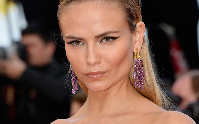 Natasha Poly offsets her simple, slicked back hair with a dramatic cat eye.
