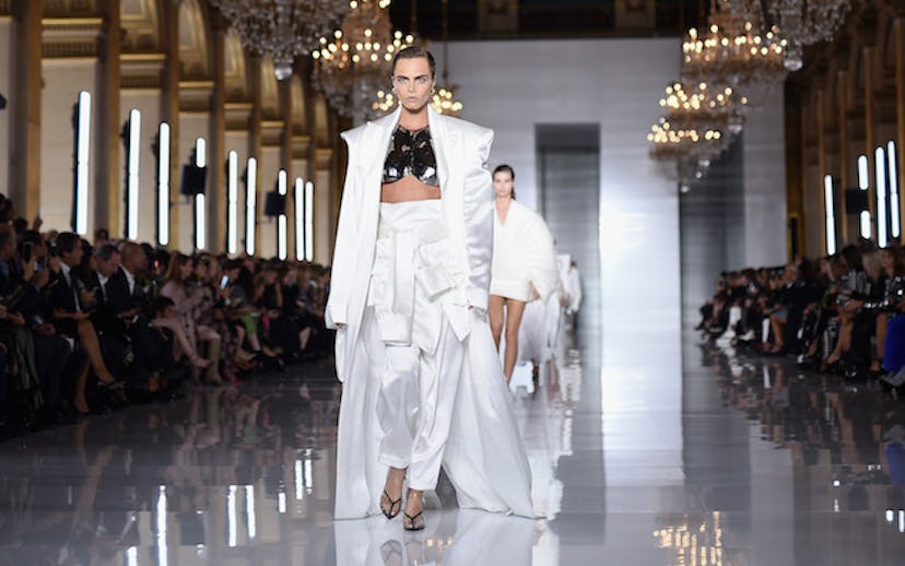 Just before the lights came on, Quindon Tarver’s cover of Prince’s “When Doves Cry”—you know, the one from Baz Luhrmann’s Shakespeare’s Romeo + Juliet—began to play. As the hypothetical curtains opened, the Prince track faded in, and out came Cara Delevingne lip-synching along to the track as she made her way down the runway. Donning a metallic breastplate under an oversized white suit, no less.