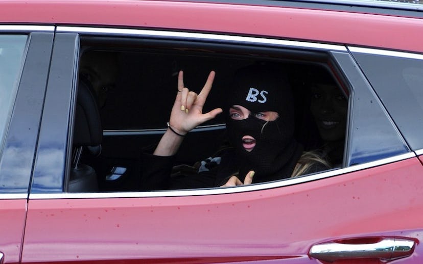 Delevingne rolled up in a red car with her model bestie, Jordan Dunn, wearing a ski mask from UK-based brand Blackscore, that she also had Harry Styles try out backstage at the show. Styles and Delevingne aren't the first celebs to try out the face-blocking style, back in May at the Met Ball, Sky Ferreira and Frank Ocean Instagremmed a pic of them together in balaclavas. Even before that, of course, was Harmony Korine's film Spring Breakers that popularized the unicorn ski mask worn by stars Selena Gomez, Ashley Benson, Vanessa Hudgens, and Rachel Korine and sold at Opening Ceremony, and Kanye West's performance in a rhinestoned Maison Martin Margiela facemask followed by an appearance in a red balaclava at the brand's haute couture fashion show this past January.