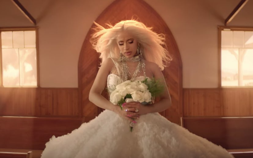 In the single's newly released video, we see the rapper get married in a Kill Bill-inspired desert-side church ceremony. Looking ethereal in a white gown, silver hair, and various crucifixes, the rapper shares her vows (the lyrics to the track) with her fiancé, warning him to treat her carefully. Halfway through the video, the wedding switches to a funeral for said fiancé. Cardi appears in an all-black ensemble and fiery red hair by her hubby's casket, where she angrily recites the rest of the track to him.