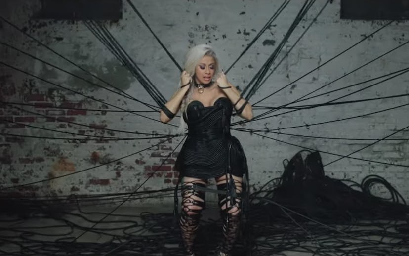 Cardi and Kehlani go full Cable Girls in the new visual, which features old-school phone jacks, cables, and telephone booths. Leave it to Cardi to bring landlines back from extinction. Throughout the video, Cardi seems to be trapped in a dungeon, tied from the walls with telephone wires which also construct her dress and strappy thigh-high heels. This scene is cut with shots of disembodied hands connecting phone lines, using a rotary dial, and hanging up or dropping phones. We also see Cardi and Kehlani contemplate calling first in trippy telephone booths floating in the sky, above a huge body of water. You know, as one does.