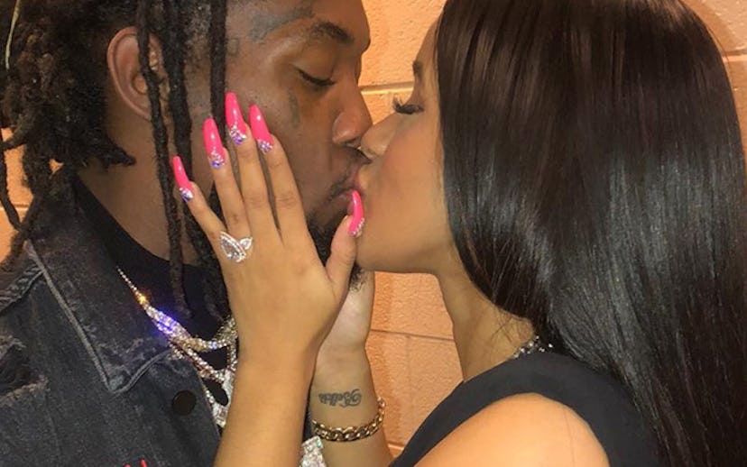 The rapper then proceeded to admire her 8-carat diamond ring. "I get Upset OFF, I turn Offset ON, I told him the other day man we should sell that porn," she wrote on Instagram, quoting her new song "Motorsport" with Migos and Nicki Minaj. "Hey babe I like the fact my ring got pink Diamonds around the Rock oooooo and of course it wouldn’t be you if it wasn’t shape like a raindrop."