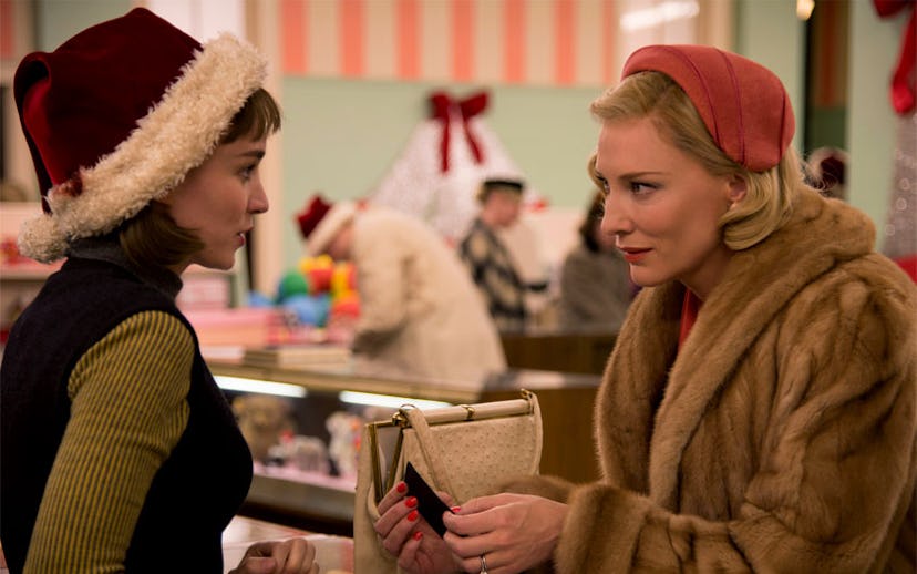 The Price Of Salt is known for having a happy ending in a genre that is infamous for the opposite. In fact, for lesbian-centered novels to even be published during this time period, there had to be some sort of consequential lesson—usually the death of a main character. Salt, though, ends with the triumph of love. Closely following the plot of the book, Carol is experienced through the lustful eyes of Therese, played by Rooney Mara. She's a temporary department-store clerk in her early 20s with a boyfriend she’s not super into, professional aspirations she’s hesitant to go for, and silly hats. Carol is older—maybe in her mid-30s—in the middle of a divorce and custody battle over her young daughter. She wears bright-red nail polish and fur coats; she carries herself with what director Todd Haynes describes as the kind of deliberate feminine poise that “you might glimpse in your grandmother, but it’s something that is not produced anymore culturally."