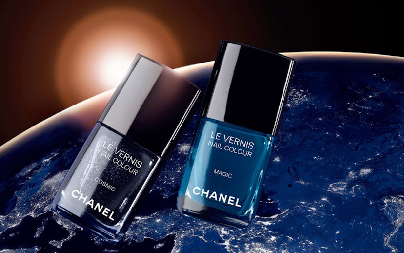 Clearly the genius behind Chanel's nail polish shades agrees with me, because the French fashion house's latest collection of lacquers, Nuit Magique, is inspired by the night sky. The limited edition series features two shades; there's Cosmic, a deep gray speckled with faint glitter, and Magic, a dark cerulean with the slightest touch of turquoise. I'm wearing both right now (used Magic as an accent nail on each hand) with a fuzzy sweater, but you could also pair them with your go-to sequined holiday party dress and be good to go. And yes, if your plan is to spend December 21st looking up at the stars--or just, you know, see Gravity in 3D--they'd totally go with your warmest puffy jacket.