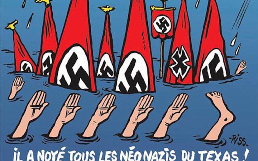 After Hurricane Harvey touched down in Texas, some people were tweeting that it was punishment for all of the Republicans in the state who voted for Donald Trump. This is, of course, just as offensive as Ann Coulter suggesting Houston was hit hardest because they have a lesbian mayor. Now, the French satirical magazine Charlie Hebdo has taken this idea a step further and suggested that the hurricane was a good thing because it drowned "all the neo-Nazis of Texas."