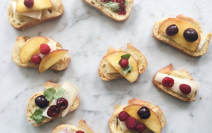 Cherry, cheese, and blueberries. It’s your red, white, and blue culinary decor. Get into the spirit with fruit and dairy on toast. It’s simple to make and even easier to eat. Experiment with other in-season fruits and herbs to make the crostini station at your BBQ the go-to appetizer corner.
