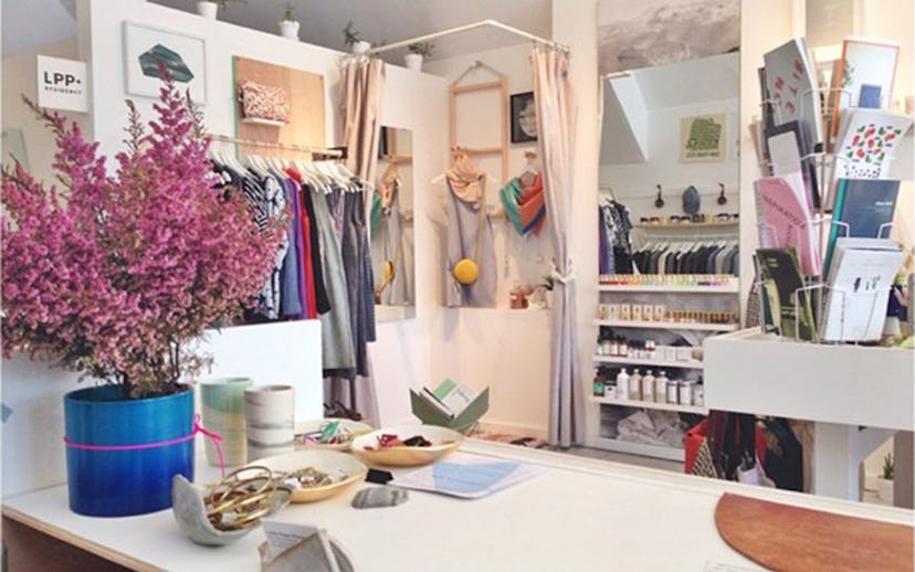 Located on Valencia Street, Little Paper Planes was opened by Kelly Lynn Jones in 2013. As an artist herself, it makes total sense that the multi-media creative has built an entire space that feels like it’s part-gallery, part-dreamworld. How does she get the look? By covering the store’s white walls with graphic design, sculptures, and paintings, all sourced from across the country and all over the Internet. Adorning the walls most recently, is the work of geometric abstract designer Elena Johnston, the latest resident artist to create exclusive prints for the shop.