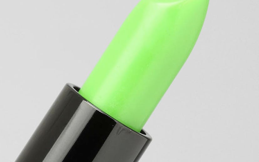 Even though we're undoubtedly ready to make green lipstick a thing (really, we are!), this lipstick above doesn't exactly fall into that category. Sure, it may look like a traffic-stopping lime in the tube. But once you actually swipe it on, the neon hue actually morphs into a light pink.