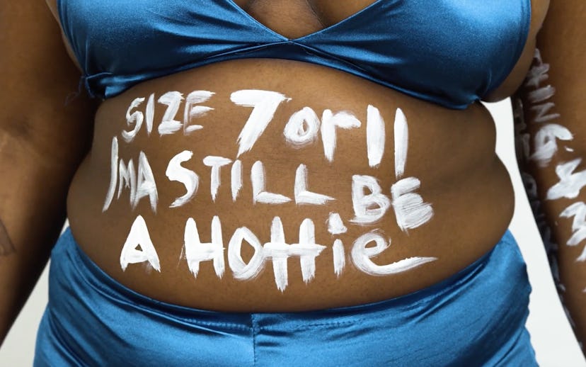 "People turning insecurities to mockeries/ Shit I could be thin or overweight, won't bother me/ I'm still choose Burger King over broccoli/ I love every inch of my body don't compare me to shawty/ Size 7 or 11, I'm a still be a hottie," spits the 20-year-old icon over an EDM inflected beat. The minimalist video, which depicts Cupcakke and some other women with the track's lyrics written on their skin, is the perfect therapy to help assuage those summer beach-body anxieties.