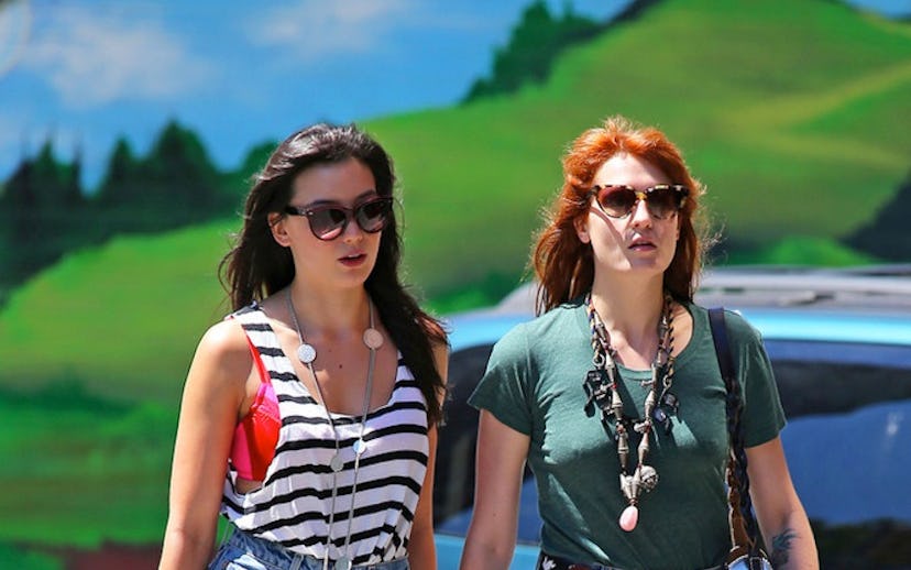Daisy Lowe and Florence Welch have their own technique for letting everyone know they're buds: wearing matching jean shorts. The British besties went for a walk (in unison) in the New York City's East Village yesterday in coordinating cutoffs. Lowe paired hers with an oversized, striped tank, pink bra, and black Mary-Janes while Welch threw on a green T-shirt, chunky necklace, and snakeskin loafers. Their purses are practically large and small versions of the same black satchel, and, yes, they are both wearing cat-eye sunnies. Do you think they called each other in the morning to plan it out, or are they just that in sync?