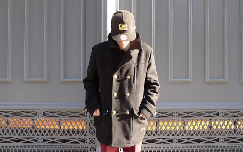 The collection consists of a heavy wool blend peacoat with satin lining and custom gold metal buttons, luxe full grain leather high-top boots with gold eyelets, and a hat constructed with Performance CycleDry fabric and New Era brim. We can tell you firsthand that the products are comprised of the highest quality materials and fabrication. A super limited quantity is available