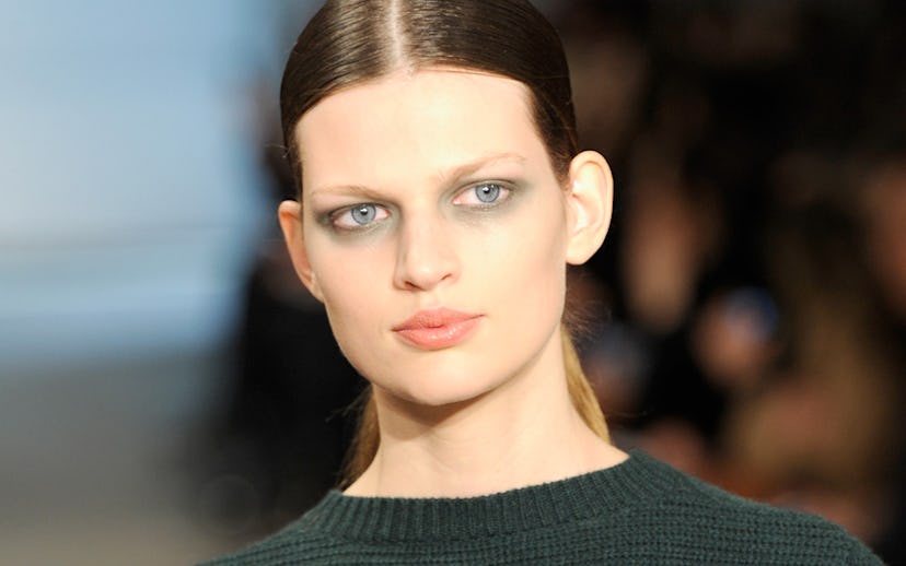 The seemingly mutually exclusive words "organic" and "urban" found a common ground in a teal smoky eye and a voluminous ponytail. For makeup artist Tom Pecheux, this meant doing an exaggerated smoky eye in a color that conjures up images of tropical swimming holes. To get it, Pecheux brushed metallic forest green and shimmery mossy green shadows onto the models' lids and below their lash lines, following the shape of their eye, then blending the edges outward. The rest of the face was fresh and natural--just perfectly glow-y skin and beige lips. Hairstylist Orlando Pita matched the statement eye with an un-boring ponytail. To add oomph to models' strands, Pita spritzed their hair with volumizing spray before blowing it out, then added loose waves from midway to the ends with a one and three quarter inch curling iron. He then created a middle part, then slicked the top back with a mix of styling cream and sculpting gel, and secured it at the nape of the neck with an elastic. To get the right amount of bigness in the tail, Pita gently backcombed the ends with a teasing brush.
