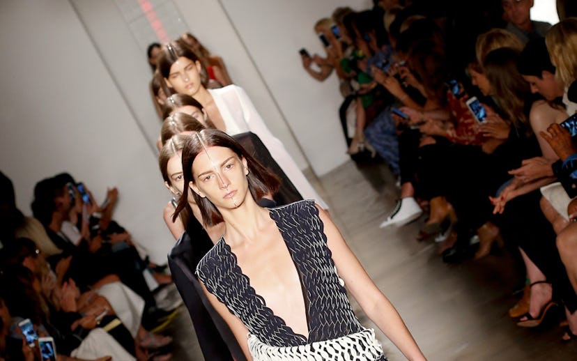 Lee’s spring/summer 2016 collection was highlighted by woven neoprene gowns and form-fitting red carpet-ready dresses, perfectly offset by slouchy, feminine suits. His signature tailoring with unexpected cutouts make a welcome reappearance, catering to the type of woman unafraid to take risks, while maintaining herself well—someone truly in the category of chic and unique. Dion also manages to insert a fierce color statement with vibrant and muddy reds existing harmoniously alongside black, navy, and beige hues. The collection is modern, cohesive, and refined—yet still with a refreshing and effortless vibe. A thin strip of metal custom fit to each model's profile hinted to a tribal, cyborg undertone to the collection.