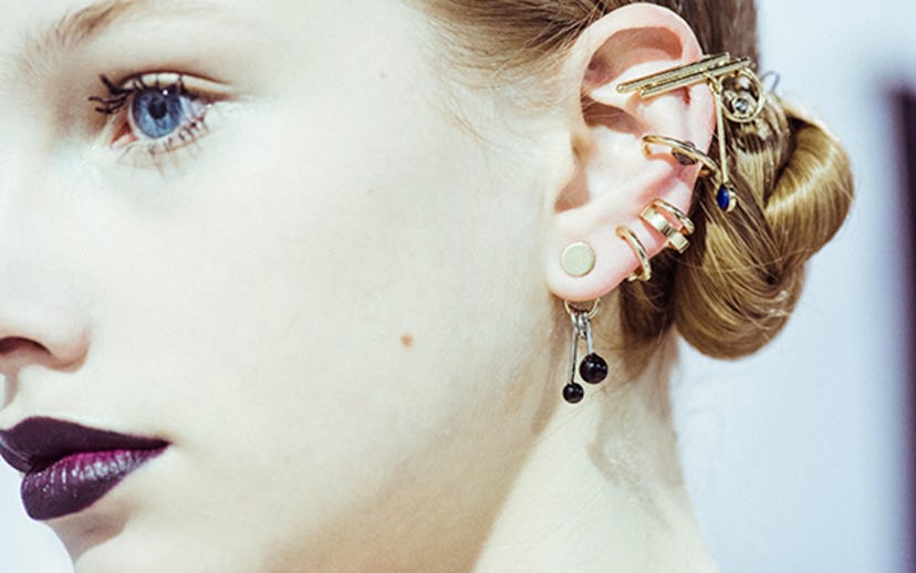 Most of the accessories piled on the models' lobes were cuffs—after all, it's not always feasible to pierce a few holes moments before starting a live streamed show—which makes the "trend" all the more easy to test out for yourself. Scurry over to your local thrift store, grab any and every clip-on you can find, and layer them on. Or if you need an easy introduction to this apocalyptic style, this ear party guide will get you started.