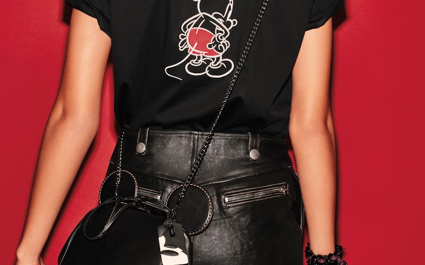 While Minnie Mouse may have been the subject of some special collaborations recently, this time, it’s all about Mickey. We’re talking cross-body bags, satchels, and backpacks in an array of colors with leather mouse ears embellishments and cartoon embroideries of Mickey himself, as well as leather jackets with studded Mickey silhouettes, graphic tees, and black leather Mickey dolls.