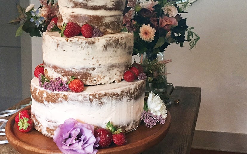7. Befriend the crumb coat. If your couple is into the rustic naked cake, congratulations, you won’t be dealing with too much frosting. If they want it semi-naked or completely manicured, congratulations, you get to enjoy the soothing and satisfying task of smoothing frosting. Either way, you’ll be applying what is known as the crumb coat. It’s the first layer of frosting that acts as glue to keep stray crumbs in place. After the crumb coat, pop cakes in the fridge to set for at least ten minutes, and then apply the final coat(s) of frosting for a beautifully clean, crumb-free cake display. Having a turntable here really helps with a seamless application.