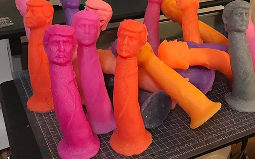 In case you were looking for a sex toy that will make your vagina want to crawl up into itself, an artist is now making Donald Trump-shaped dildos. A photo was posted, by a parody account Beverley Hills Antifa, of the artist, who goes by Hutchtastic, sitting with her colorful array of Trump dicks. "Protest Trump By Putting Him Inside Of You," the caption reads. Nooo, thank you.