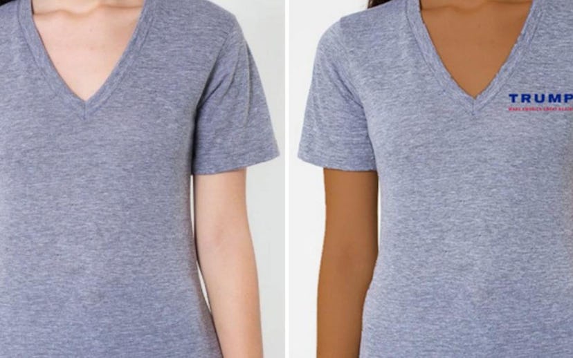 As Mic related to us, a staffer for Maryland Congresswoman Donna Edwards' campaign for Senate, posted a screen cap of a model wearing a Trump shirt from the campaign’s online store next to the original image from JCG Apparel’s—the provider of the actual shirt—website.
