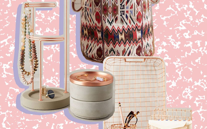 Sung Wook Park for Umbra, Tesora Jewelry Sotrage Collection, $48, view at Anthropologie; Anthropologie, Canyon Basket, $78, view at Anthropologie; Anthropologie, Copper Lattice Desk Collection, $78, view at Anthropologie.