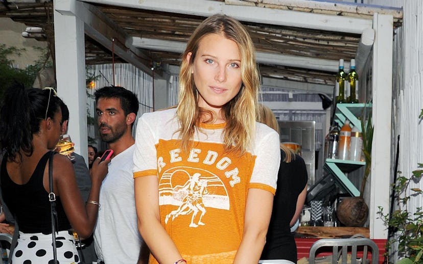 At yesterday's Australian Fashion Fund summer bash in New York City, the actress and model took an unlikely color— in this case, a bright tangerine athletic tee— and paired it with a half-sheer white skirt and a complementary clutch. Coupled with polka dot heels and practically zero makeup, this is the epitome of an unexpectedly awesome look.