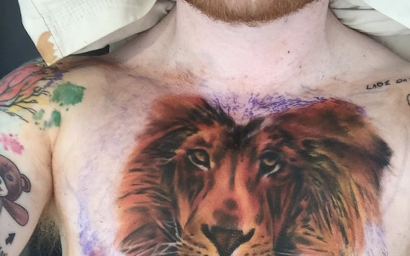 Like, is this tattoo—which would be at home on a velvet canvas—even real? If it is, what does it mean? Is it a misguided tribute to Cecil the Lion? Is rumored girlfriend Nicole Scherzinger going to enjoy running her hands over it? Does it have something to do with his orange hair? Is he going to pull his shirt up over his head and run around going “rwwwaarr”?