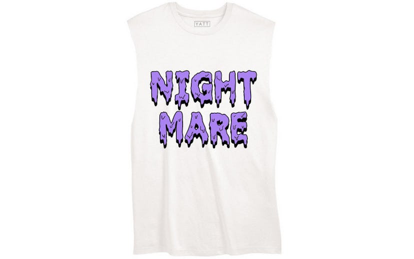 Just because spring is coming doesn't mean you have to pack your closet with floral dresses and pink skater skirts. There are some pretty cool ways to say "picnic weather" without looking so sweet that the ants will be all over you instead of your peanut butter and jelly sandwich. I find that the easiest, coolest way to look the part is just by adding bright lipstick to anything you want to wear. Take for instance this pretty badass tank top, which reminds me of both DIY-slash-horror-punk band The Misfits' logo, as well as the lettering for the ultimate in '90s horror stories, the Goosebumps book series--neither of which say "hello, spring." But, the inspired tank does add a bit of sass to an otherwise way too sweet look, and you can get it right here in the NYLON Shop. So next time you feel like spicing up your sweet spring outfit, try throwing on a super edgy shirt and pairing it with bright lipstick. The cutoff says "it's warm out," the pink lipstick says "it's sunny, too!" and replacing your skirt with an ooey gooey purple nightmare says "my picnic is going to be way cooler than yours."