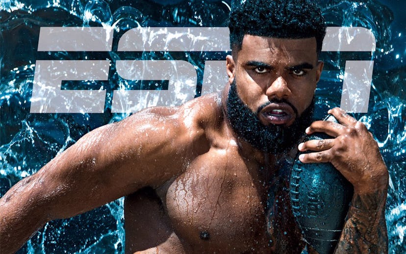 After decades of seeing naked women on the covers of their sports magazines, many fragile dudes were broken upon seeing ESPN's 2017 Body Issue cover star, NFL running back Zeke Elliott. His cover was released in GIF form on the channel's Twitter account, and in it, he's posing nude in water while holding a football.