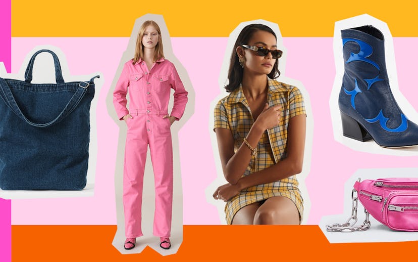 Topshop, One Shoulder Drop Jacquard Dress, $95, available at Topshop; Ganni, Denim Jumpsuit, $475, available at Ganni; Zara, Oversized Sweater, $49.90, available at Zara; Mango, Ruffled Midi Dress, $79.99, available at Mango; Alexander Wang, Satin Attica Mini Fanny Pack, $695, available at Alexander Wang.