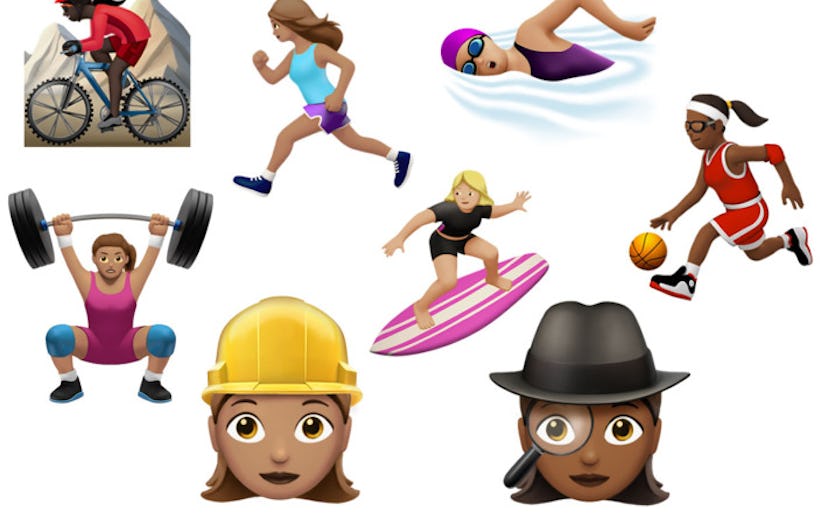 As far as activities off the clock are concerned (unless you're an athlete), women can now be runners, swimmers, surfers, basketball players, cyclists, and weight lifters too. Oh, and all of these characters are available in multiple skin tones because diversity is still a priority in the emoji universe. New foods and faces are also on the roster, in case those have been lacking for you in your communications.