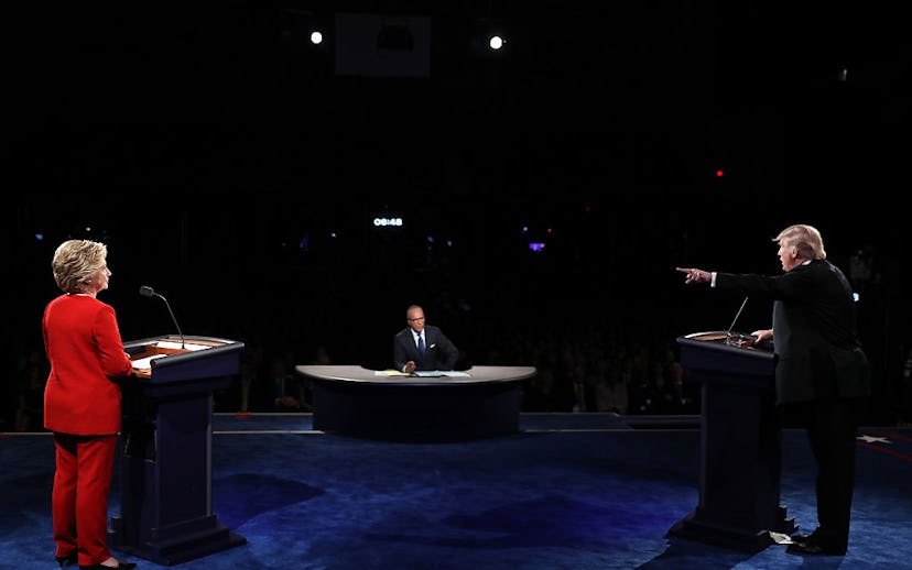 There were many moments of note during last night's debate between presidential candidates Hillary Clinton and Donald Trump. There was the point at which Trump took pride in not paying federal income taxes ("that makes me smart"), despite his assertion that American infrastructure is like that of a "third world country," which is a problem that could be potentially solved with the aid of... federal tax dollars. There was Trump's constant sniffling, water guzzling, water blowing (??), and general mouth-puckery. There were multiple denials by Trump that he'd supported the Iraq War from the beginning (but he did), that he'd ever accused China of perpetuating climate change as a "hoax" (but he did), that stop-and-frisk was found unconstitutional (but it was), and that New York City's murder rate has gone up since stop-and-frisk was outlawed (it hasn't). There were the expected malapropisms: "bigly" and "a very against police judge" spring to mind, with "braggadocious" a close third. (Yes, technically it's a word, but it's almost never used in modern dialect.) And baseless accusations, such as Trump's contention that Clinton has been fighting Isis her "whole adult life," which would be hard, considering Isis is less than 15 years old, and Clinton turned 18 in 1965.