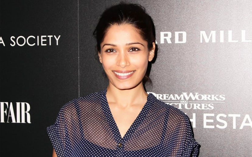And sure, it's fun to experiment with an unexpected lip color or attempt a smokey cat eye on, say, Saturday night when you've got plenty of time. But on mornings like this one? Considering it's impossible to roll out of bed without hitting snooze a couple of times first, we need to nail our beauty routine in five minutes flat. Fortunately we have Freida Pinto giving plenty of inspiration, thanks to her naturally pretty look at The Fifth Estate screening over the weekend. The actress's clear, perfect skin plus long, curled lashes equals a result that's easy to replicate--so foolproof, you can even do it half-asleep.