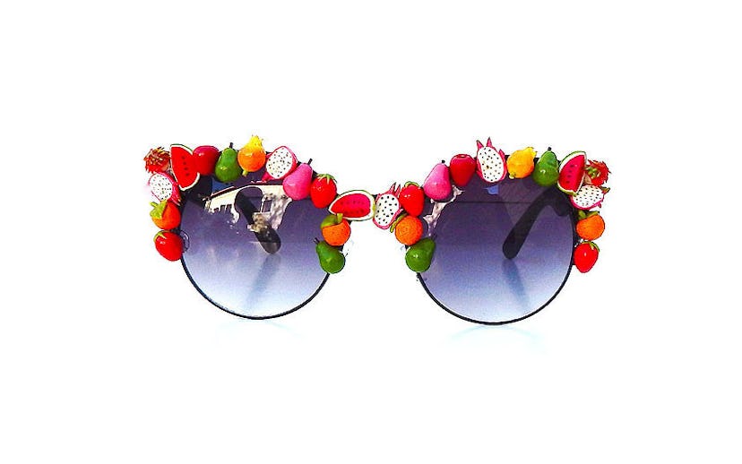 I've always loved '40s style icon Carmen Miranda--blame it on my Latin roots, but the moment my third grade teacher announced that we were having "Dress Like a Famous Person" day, I rushed home and put together a "Chiquita Banana" outfit: my mom's bright '80s floral sweetheart neckline strapless dress (over a T-shirt so as to be school appropriate) and a headdress I crafted out of plastic toy fruit and strategically placed scotch tape. I flounced into school triumphantly the following week, feeling very chick-chica-boom chic. These sunnies are a (slightly) more mature, PC, and nostalgic take on that moment--can't wait to rock them at summer festivals!