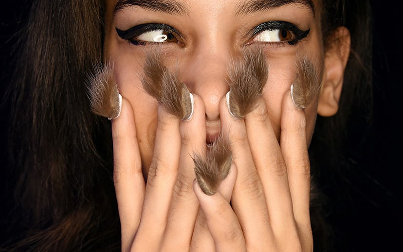 It all started with the Libertine show last week during New York Fashion Week. CND, the brand responsible for some of the craziest and most intricate nail designs on the runway this season, were of course accountable for this new craze, as they sent half-human, half-wolf models marching down the runway with fur-covered nails.