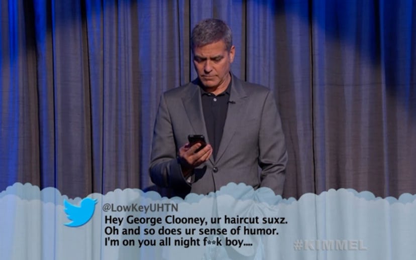 The latest self deprecating celebrities to get in on the action were Halle Berry, Naomi Watts, Tobey Maguire and George Clooney, who finally got called out for his sucky haircut and shoddy sense of humor. And because the folks at Jimmy Kimmel Live! love us, they managed to cut together all of the live mean tweets from the week, so we can relive the best that trolls have to offer.